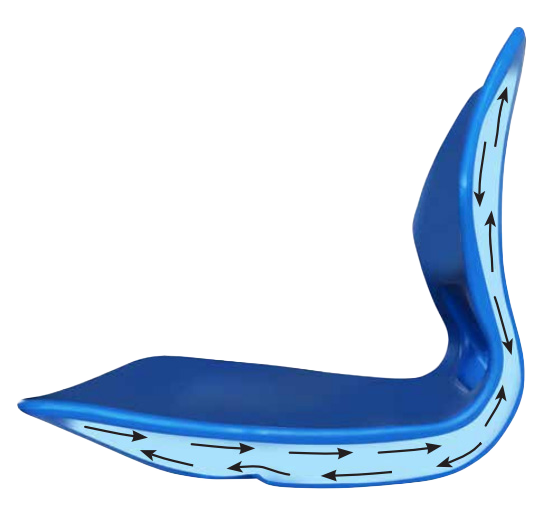 Sedací skořepina z 100% recyklovatelného polypropylenu s integrovaným vzduchovým polštářem a mikroperforacemi pro vnitřní cirkulaci vzduchu