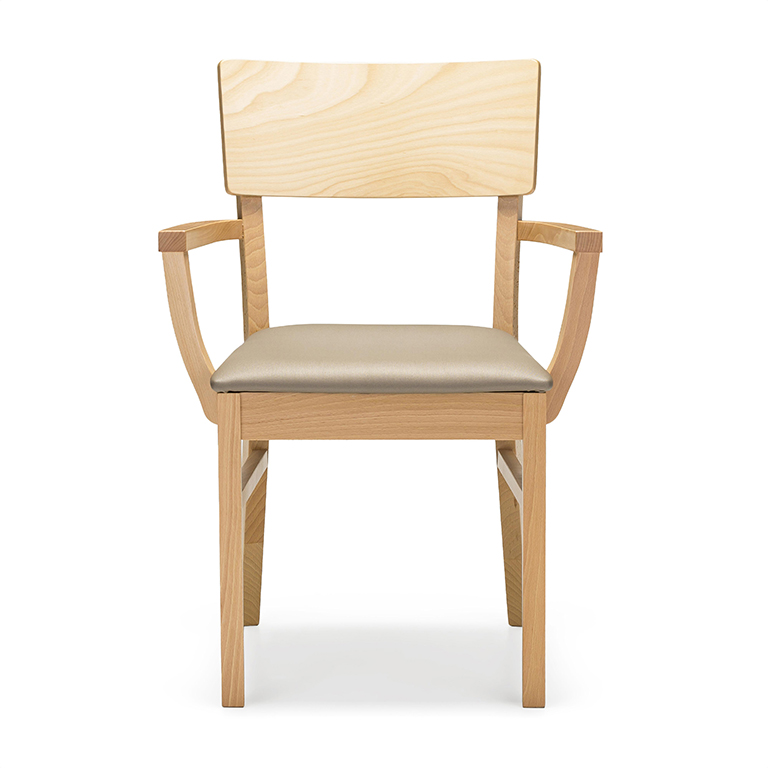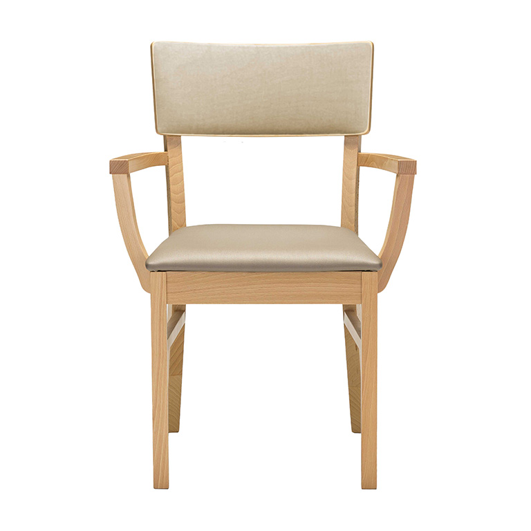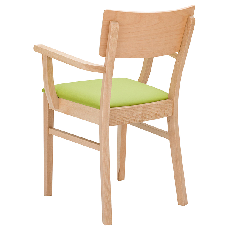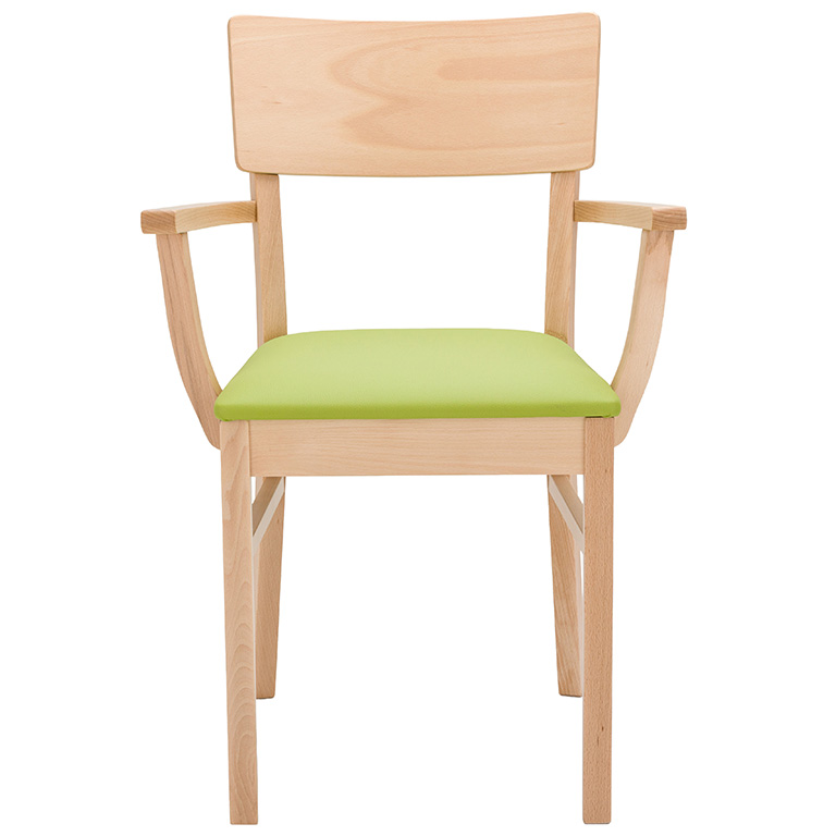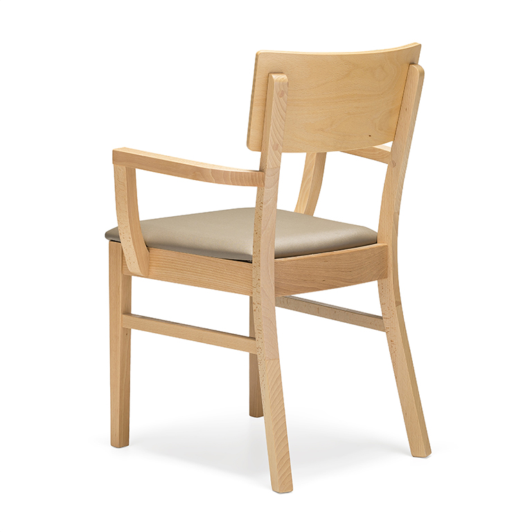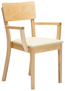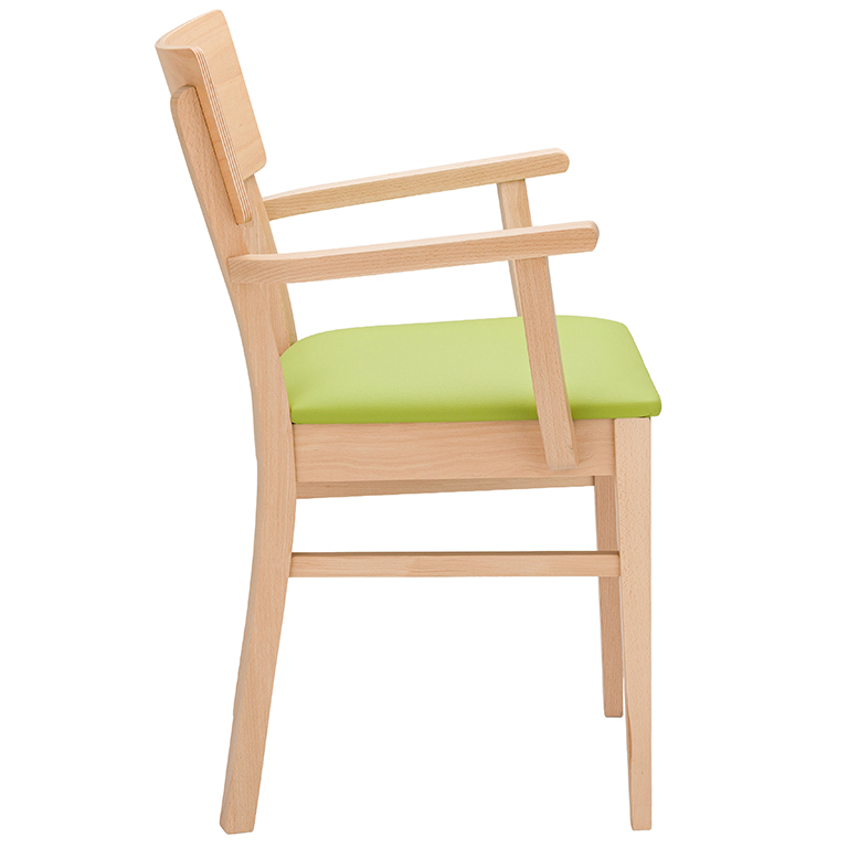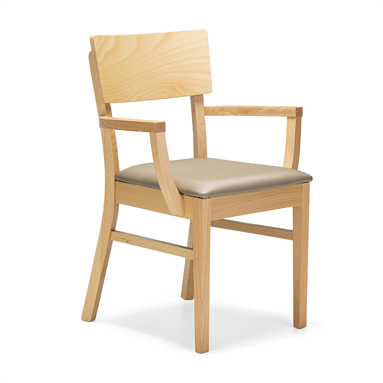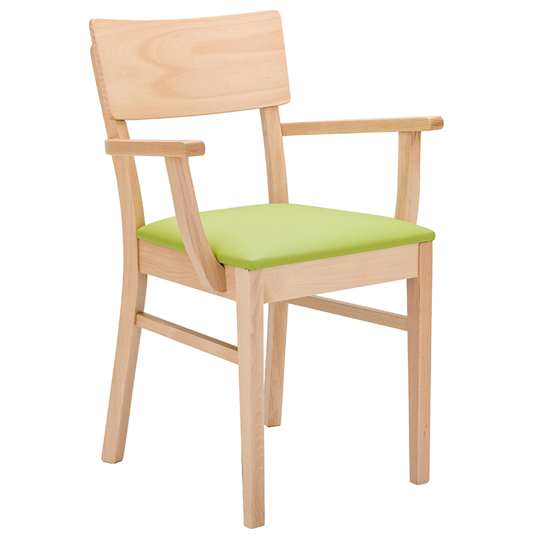 Prostorné a stohovatelné dřevěné židle, dostupné s prodlouženými područkami pro podporu při vstávání a v čalouněných variantách