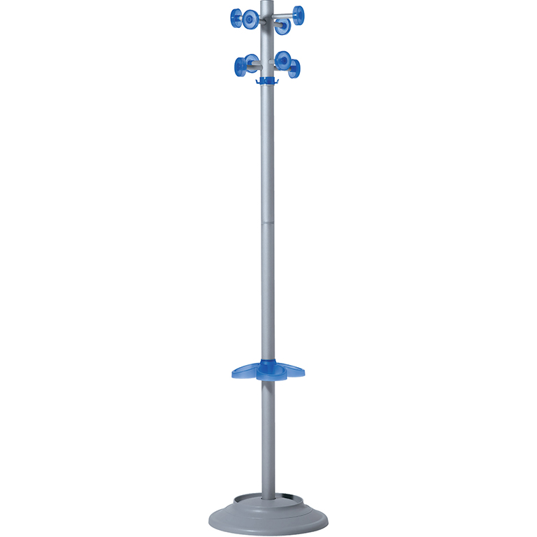 Praktický přenosný kovový věšák v šedém provedení zaujme svými modrými průhlednými plastovými koncovkami, které mu dodávají originální vzhled. Spojuje moderní design s prověřenou kvalitou a hodí se do kanceláří, konferenčních místností, dílen, obchodních prostor i domácností. Díky lehké konstrukci ho snadno přemístíte přesně tam, kde je zrovna potřeba.