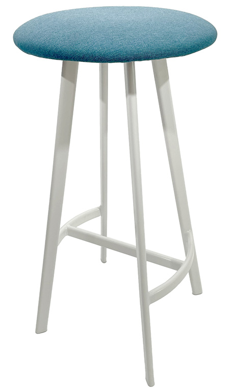 Čalouněná stolička s výškou 75 cm je ideální k vysokým stolům nebo barovým pultům. Sedák v modré látce Bombay 57 doplňuje pevná kovová konstrukce se čtyřmi nohami v bílé barvě RAL 9003, která zajišťuje stabilitu i odolnost při každodenním použití.