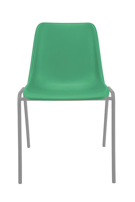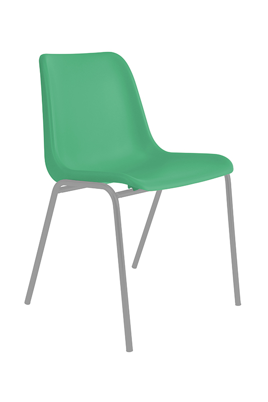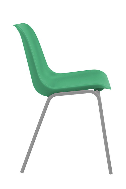 Moderní židle se zelenou plastovou sedací skořepinou a odolnou kovovou podnoží v šedém odstínu RAL 9006. Stylové a praktické řešení pro veřejné i pracovní prostory.