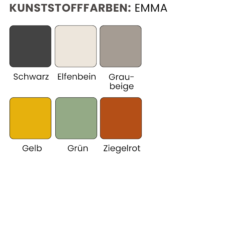 Die Serie EMMA ist in sechs modernen Sitzschalenfarben und verschiedenen Gestellvarianten verfügbar und passt sich flexibel Ihren Anforderungen an. Wählen Sie zwischen stapelbaren Vierfußstühlen, drehbaren Bürostühlen oder Traversenbänken – alle individuell konfigurierbar mit verschiedenen Gestellfarben, Bezugsstoffen und praktischem Zubehör für maximale Funktionalität.