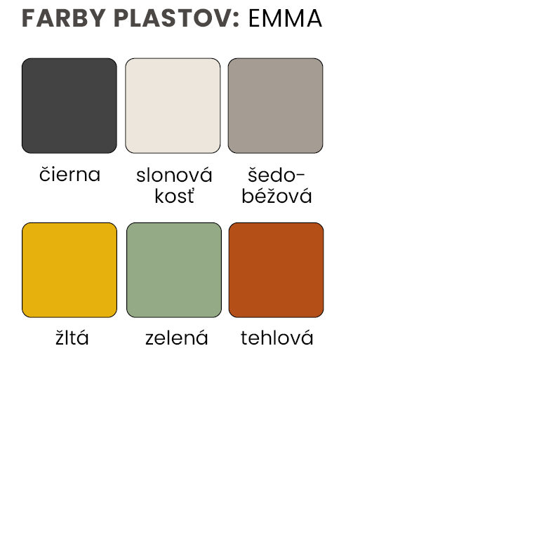 Séria EMMA je k dispozícii v šiestich moderných farbách sedacej škrupiny a s niekoľkými typmi podnoží, takže sa ľahko prispôsobí vašim potrebám. Vyberte si stohovateľné štyrinohé stoličky, otočné kancelárske modely alebo multisedáky – všetky je možné doladiť farbou konštrukcie, čalúnením a praktickými doplnkami pre maximálne pohodlie a využitie.