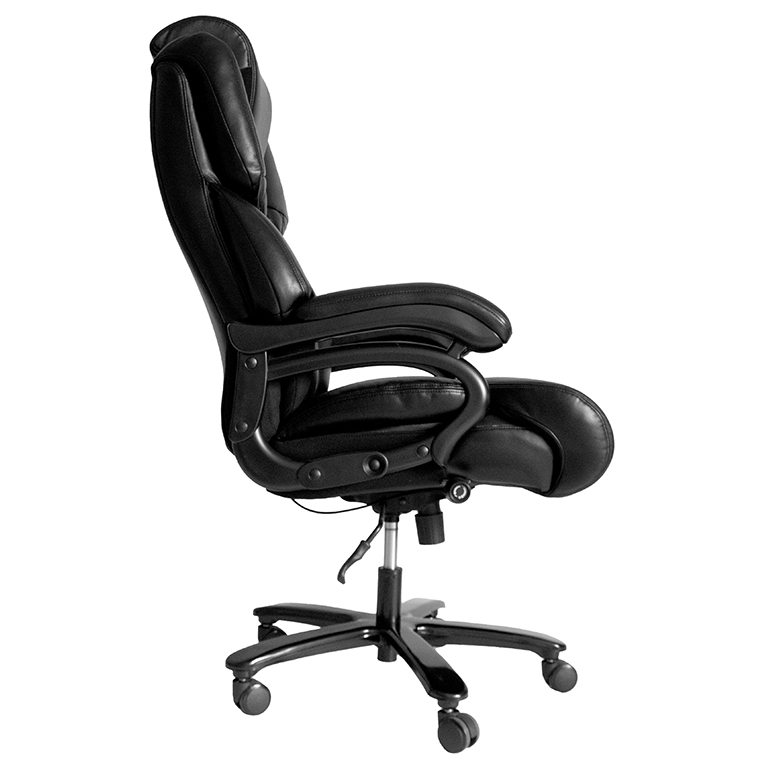 Veľké kancelárske kreslo v modernom štýle s hojdacím mechanizmom. Operadlo a sedadlo je čalúnené v čiernej koženke. Stolička má nosnosť až 140 kg