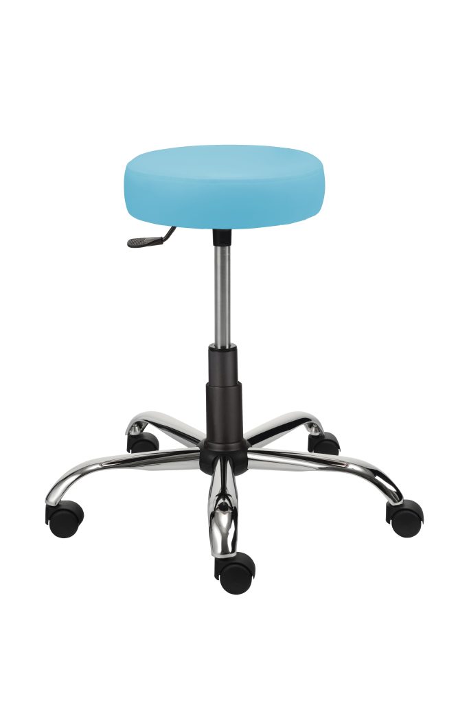 Okrúhle sedadlo v bledomodrej koženke s vysokým čalúnením má priemer 32 cm a je otočné o 360°.